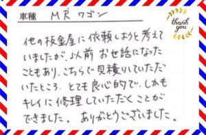 お客様の声 【修理内容】リアバンパー交換・修理【車種】スズキ・MRワゴン【柳川市/男性】