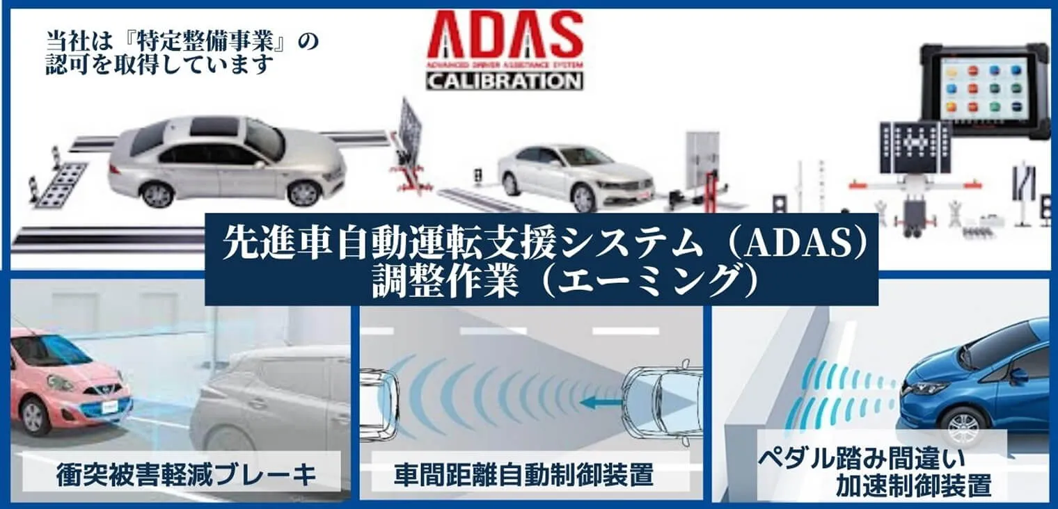 安全運転や自動運転機能を搭載した先進車の修理・整備後に、カメラ・レーダーなどの設置位置、また 正常に作動するか、再調整する作業の名称になります。 エーミングには、必要な機材・環境(工場)、資格など条件を備えた『特定整備認証工場』での調整が 必要となり、当社も数少ない『特定整備認証工場』になります。