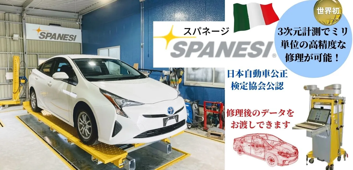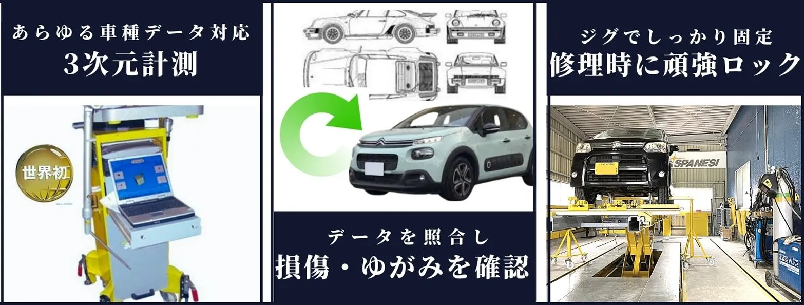 フェラーリ・フィアット ・ランボルギーニ等世界的にも知られた自働車先進国・イタリアで生まれた世界初の3次元計測・フレーム修正機になります。·3次元で計測し、精密なデータをもとにしっかり車を固定し、修理するため、ミリ単位での修正が可能です。 日本自働車公正検定協会に認定されています。