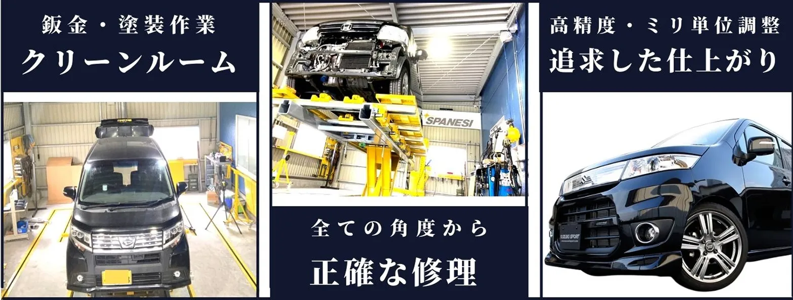 販売されている最新の車(先進車)から普通車まで修理が可能です。現在の車には、車間距離・ブレーキなどの安全装置が装備されており、事故や衝突で車に損傷が生じた場合、正確に測定し、車のボディ全体のゆがみ、フレーム修正を行う必要があります。ズレがあると、安全装置が正しく作動しなかったり、誤作動が生じる可能性もあります。